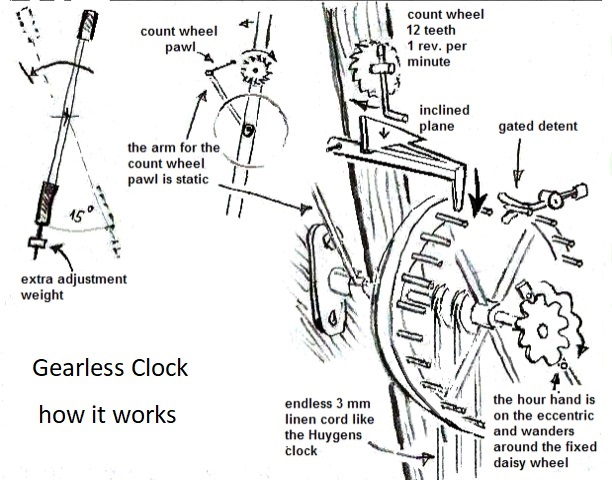 My clock was inspired by the gearless clock built by the eminent mathematician, radar engineer and horologist Philip Woodward. (Wikipedia) It has some features in common with his clock: a count wheel turning once a minute, a wheel wth 60 pins turning once an hour and a catch or gated detent. Also, like most of my clocks, it has a daisy wheel to move the hour hand. Unlike the original it has a compound pendulum (that is, the hinge is near the middle) with a period of 5 seconds, and a rather different mechanism.